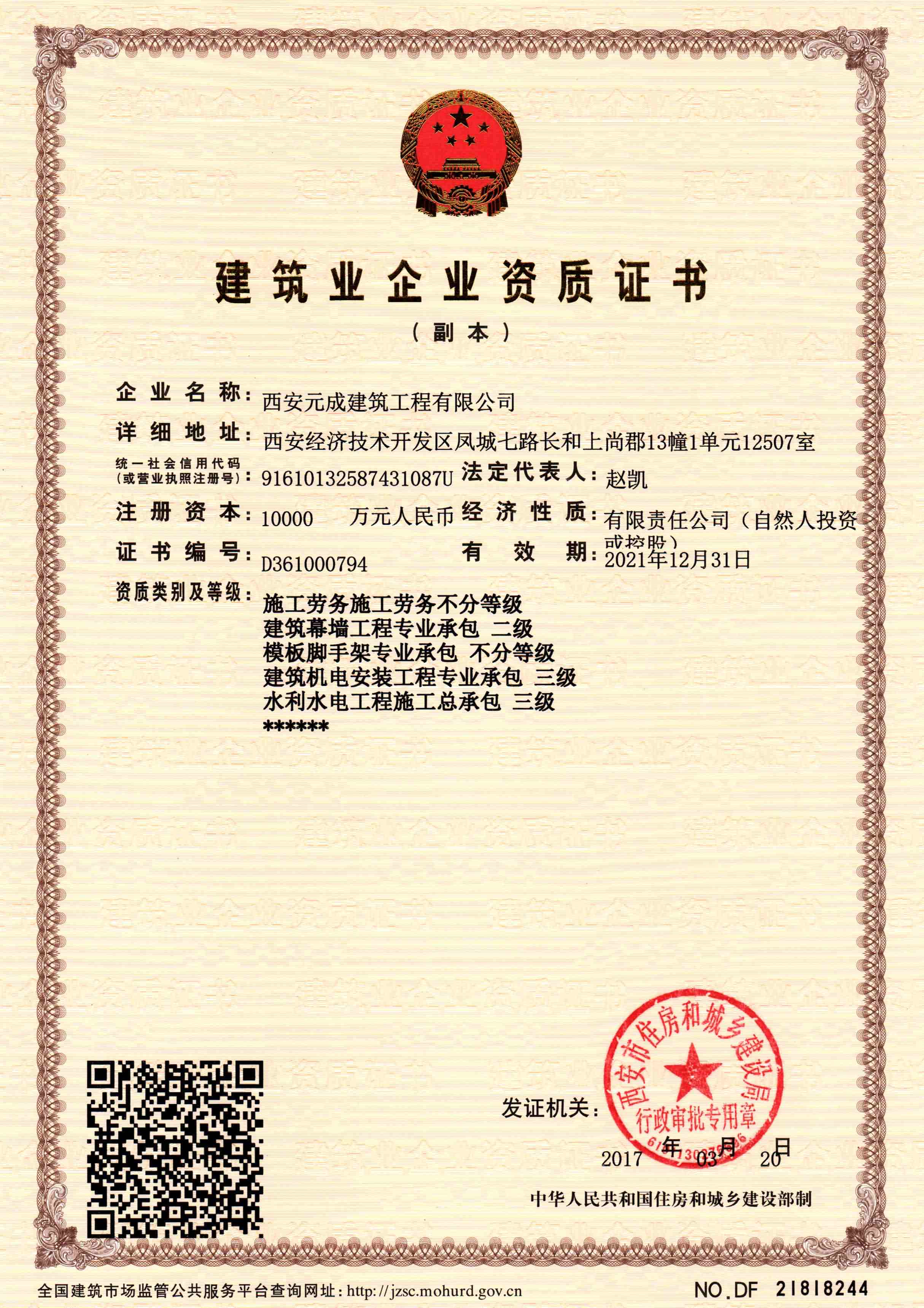 西安元成建筑工程有限公司成立于2012年,是一家擁有建筑工程、市政公用工程、石油化工工程、機電工程施工總承包貳級;鋼結構工程、防水防腐保溫工程專業承包貳級;電力工程、水利水電工程施工總承包叁級;建筑機電安裝工程、輸變電工程、環保工程專業承包三級;模板腳手架專業承包、勞務分包等綜合性施工企業。